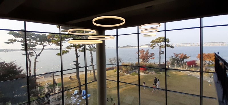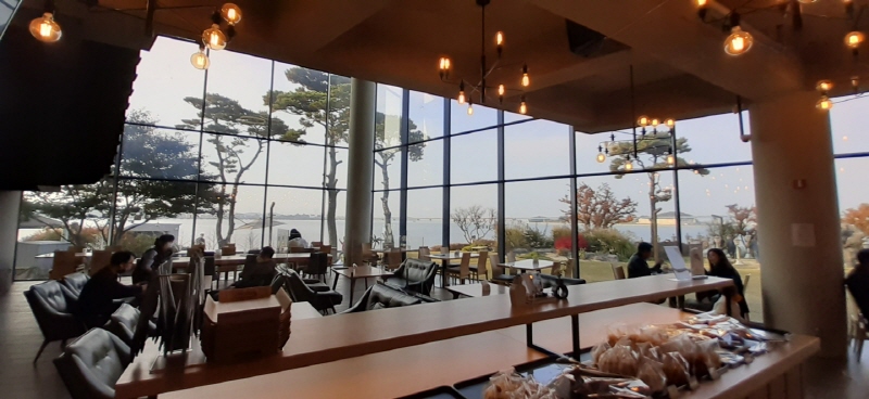 당진 '해어름' 카페의 가장 큰 매력은 뭐니 뭐니 해도 바다를 안고 있는 인테리어입니다. 실내에서 어디서라도 커다란 통유리창 너머로 펼쳐지는 서해의 수평선을 바라보고 있으면, 카페 안에 앉아 있어도 바다가 바로 곁에 있는 듯한 근접한 기분이 듭니다.