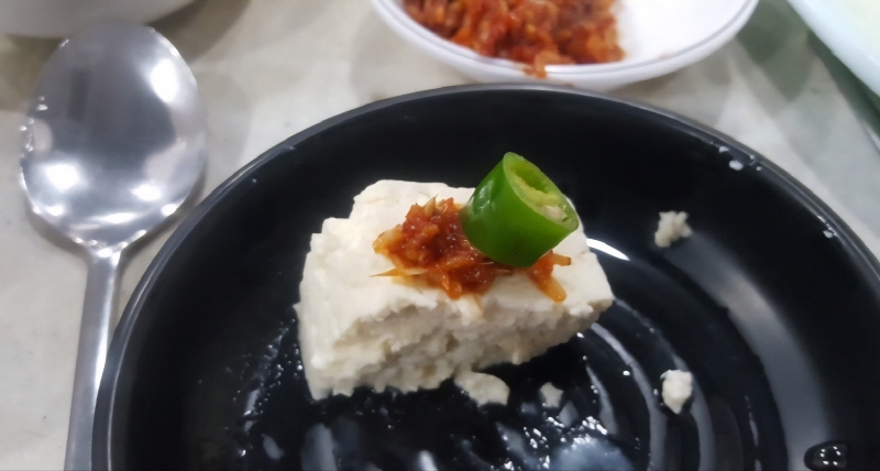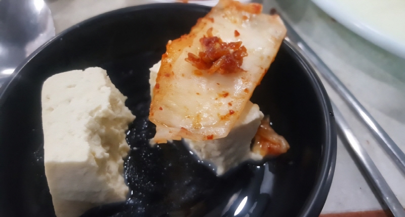 처음은 그냥 모두부만, 두번째는 새우젓이랑, 세 번째는 청양고추로, 마지막으로 김치와 한 점으로 마무리하면 원조할아버비순두부 모두를 먹어보는 경험을 할 수 있습니다. 특히 김치는 적당히 익어서 배추의 아삭한 질감이 살아 있어 모두부와 아주 잘 어울립니다.