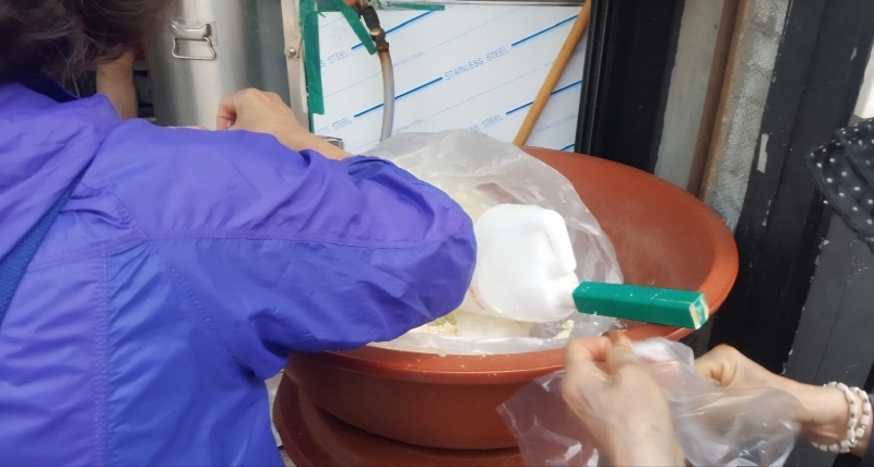 하루에 두부를 많이 만들다 보니, 그 과정에서 바로 나오는 비지는 출입구 쪽에 따로 마련해둡니다. 식사를 마친 후 원하는 만큼 직접 담아 무료로 가져갈 수 있어서, 손님들이 무척 만족해합니다.