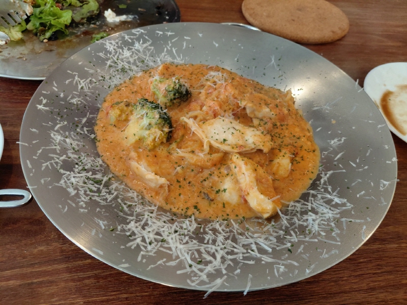 그 란치 오는 홍대게 살과 날치알이 듬뿍 들어간 로제 파스타입니다. 통통한 홍대게 다리살과 톡톡 터지는 날치알의 조화가 매력적인 메뉴로, 로제 소스와 해산물의 조합을 좋아하는 분들께 특히 추천하고 싶습니다.