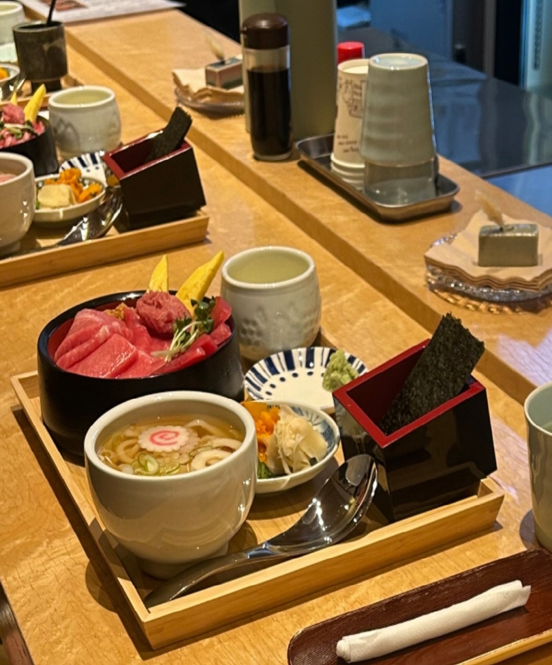 정자역 쿠로마구로를 방문한다면, 무엇보다 오마카세 구성이 가장 큰 매력적이지만 점심에는 정식으로 참치의 여러 부위와 우동을 먹을 수 있는 점심특선이 직장인들 사이에 인기메뉴 입니다. 처음엔 담백한 부위로 입맛을 깨우고, 차츰 기름진 부위로 넘어가면서 참치의 진한 맛을 제대로 느낄 수 있습니다.