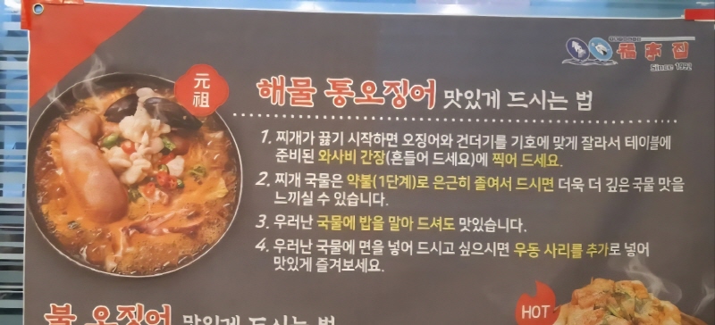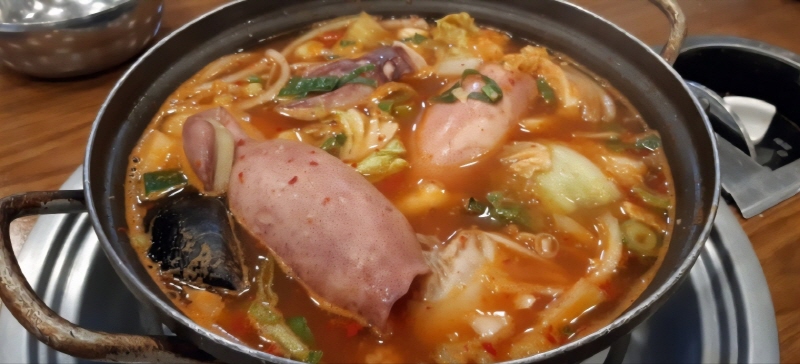 메뉴 이름이 좀 애매모호해서 궁금증이 유발되지만 한마디로 해물전골이라고 생각하면 됩니다. 여러종류 해물과 통오징어가 들어간 얼큰한 전골입니다. 통오징어를 올려주는 비주얼로 입소문을 타면서 알려져 충무로에서 식사하기 좋은 집으로 알려졌습니다.