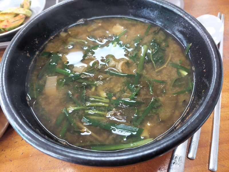 또 하나의 특징은 육수입니다. 사골국물 대신 멸치, 다시마, 무, 파 등 천연 재료만을 우려내어 국물이 깔끔하고 담백하게 만듭니다. 그리고 나서 먹고 나면 속이 부담스럽지 않고 편안하다고 합니다. 조리도 서두르지 않고, 재료 하나하나의 맛이 충분히 우러나도록 오랜 시간 천천히 끓냅니다. 이렇게 정성과 시간이 담긴 올갱이해장국이기에, 기사식당은 괴산의 대표 맛집으로 자리 잡을 수 있었던 것 같습니다.